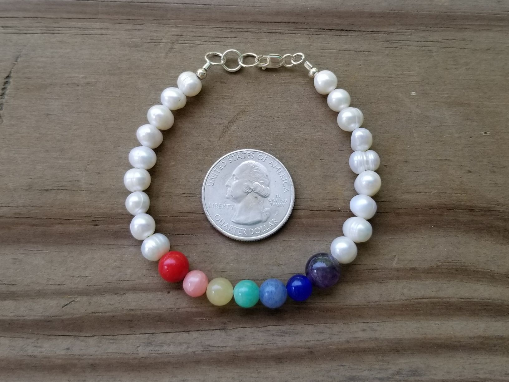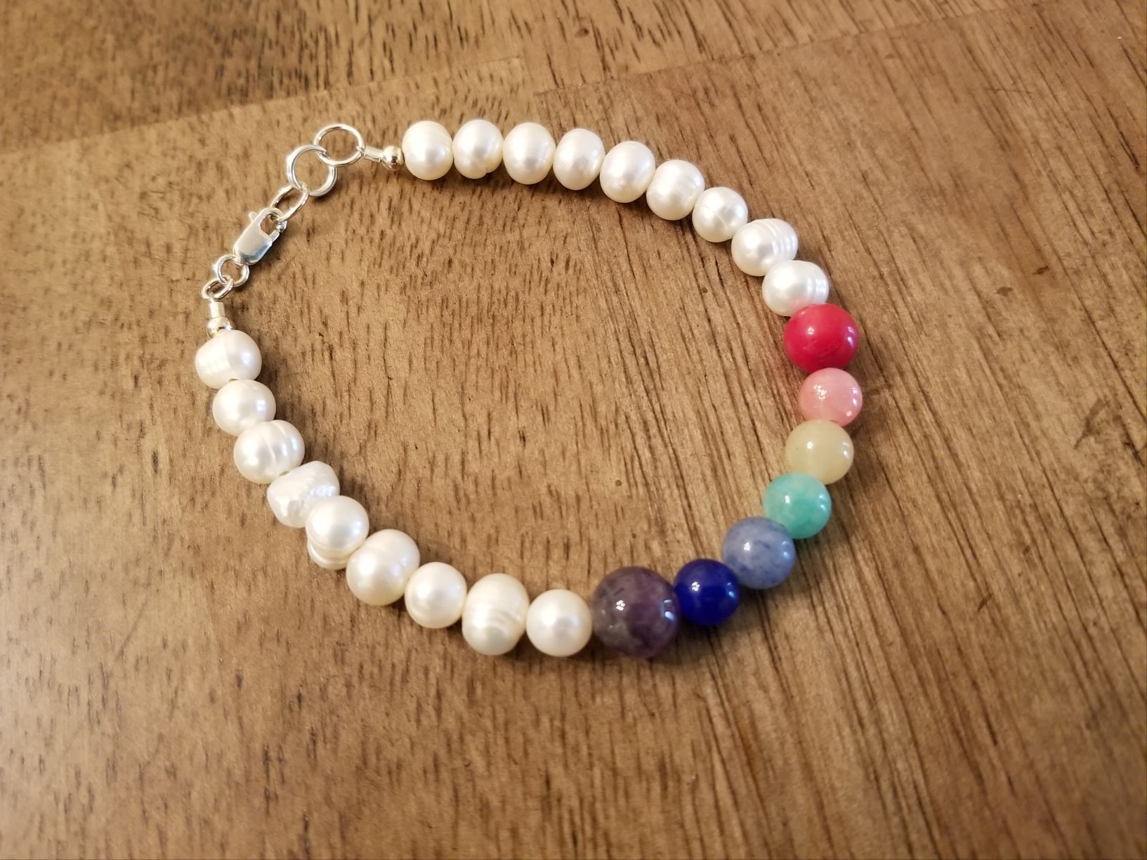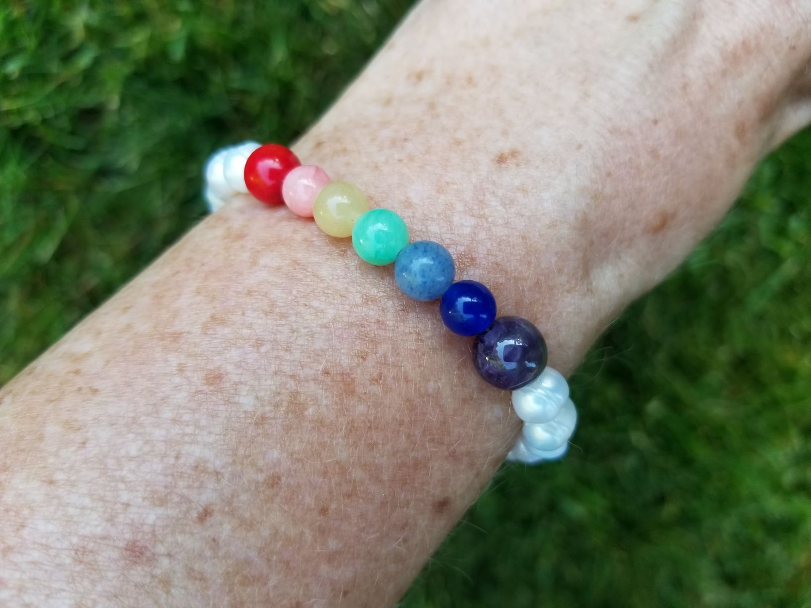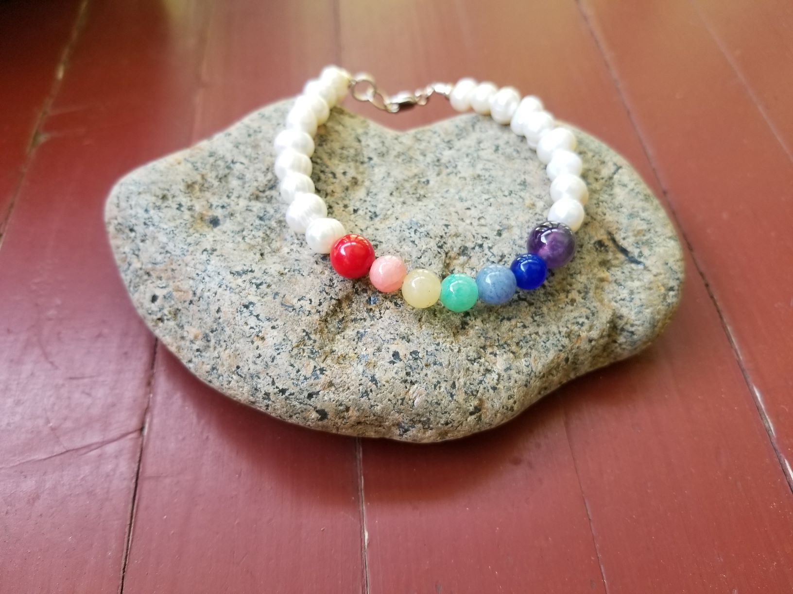 B244 Multi Genuine Gemstone and Natural Freshwater Pearl Chakra/Pride Bracelet – This handmade bracelet contains an amethyst, 2 blue aventurine, green, yellow and peach quartzite and a red dyed bamboo coral bead in the center section. The bracelet also contains 7 x 8 mm white freshwater pearls. The bracelet is strung on durable beading wire with sterling silver findings which includes a lobster clasp. This unique bracelet measures an adjustable 7 1/8 – 7 1/2 inches long. **Chakra energy healing bracelets are believed to help balance your seven energy centers. Wearing a happy rainbow colored bracelet can be enough to lift your spirits and show your pride. The colors make it versatile to wear with anything!