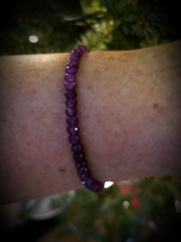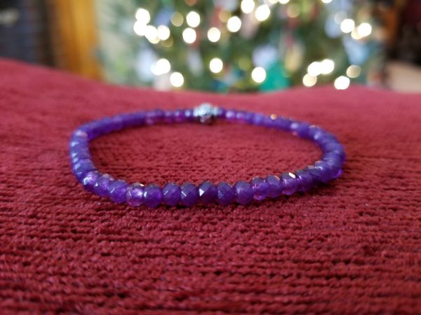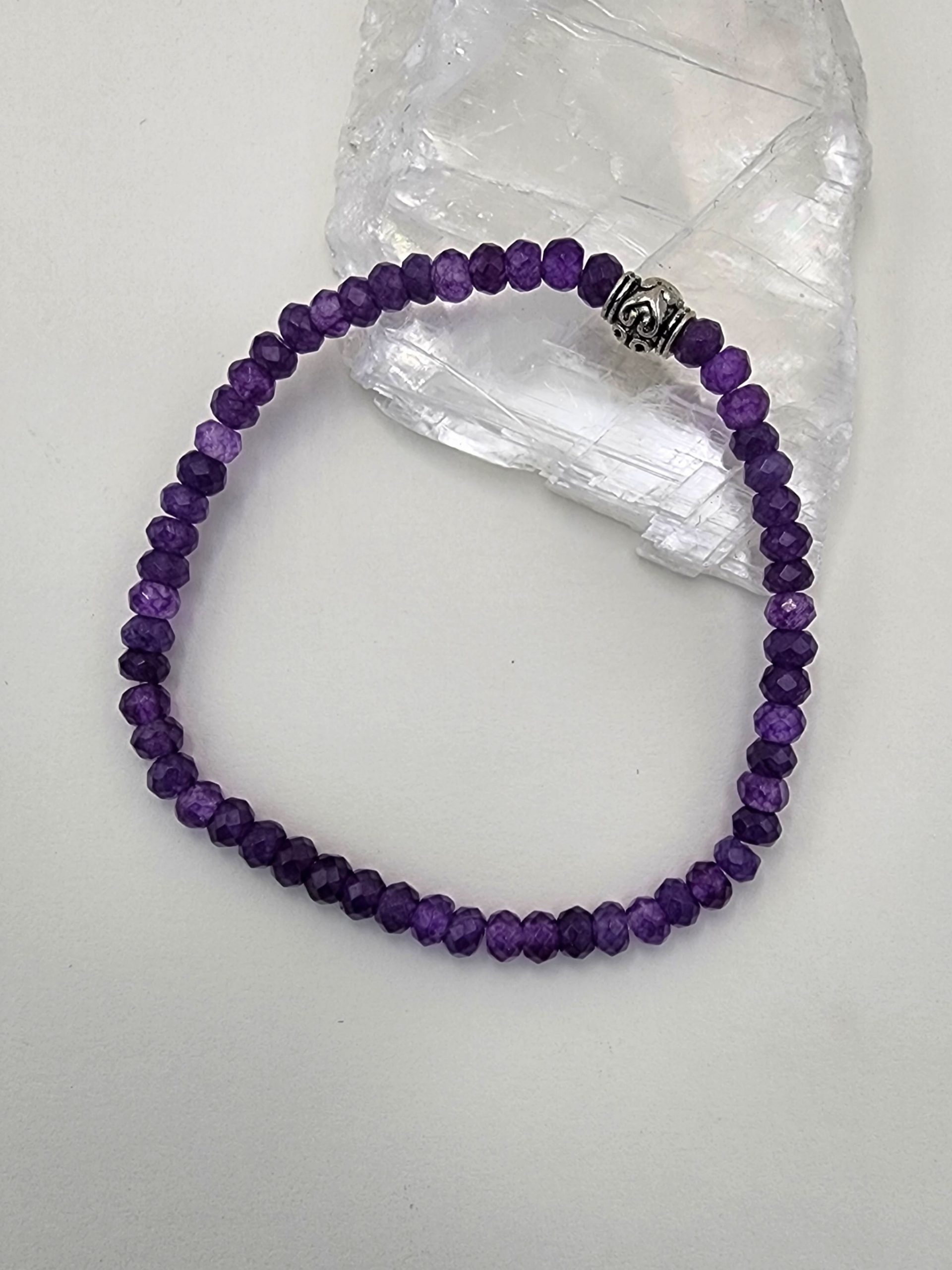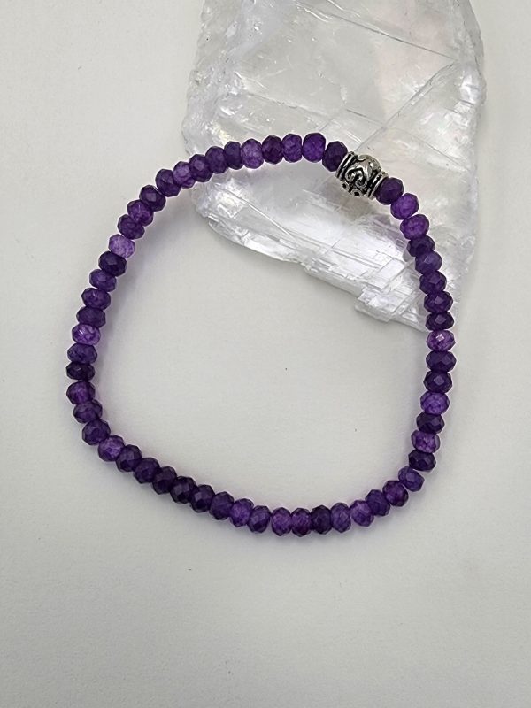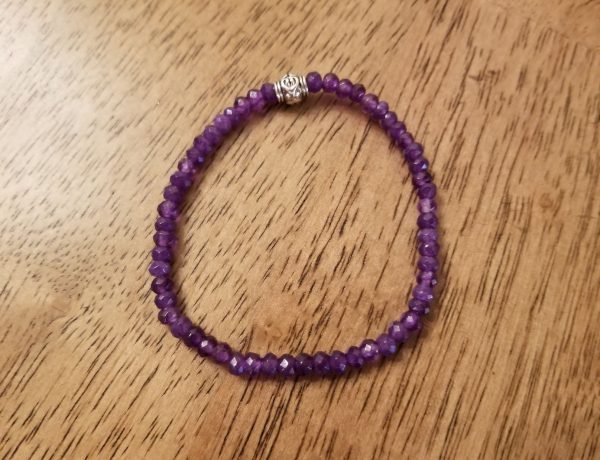 B310 Faceted Purple Jade Stackable Stretch Bracelet – This handmade bracelet contains 4 x 3 mm rondelle shape, faceted, dyed purple jade gemstone beads along with a silver plated, antiqued scroll heart barrel bead.  The beads are strung on durable beading stretch cord.  The deep purple faceted beads sparkle as you move. The bracelet measures approx. 6 7/8 inches long and stretches to fit most wrists.  *JADE is believed to promote harmony, luck and prosperity.