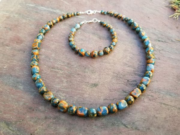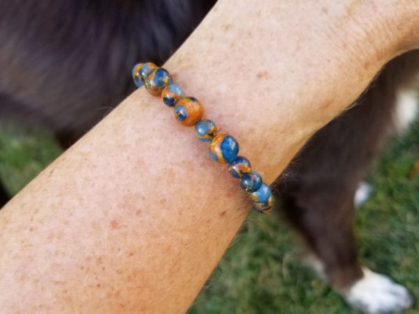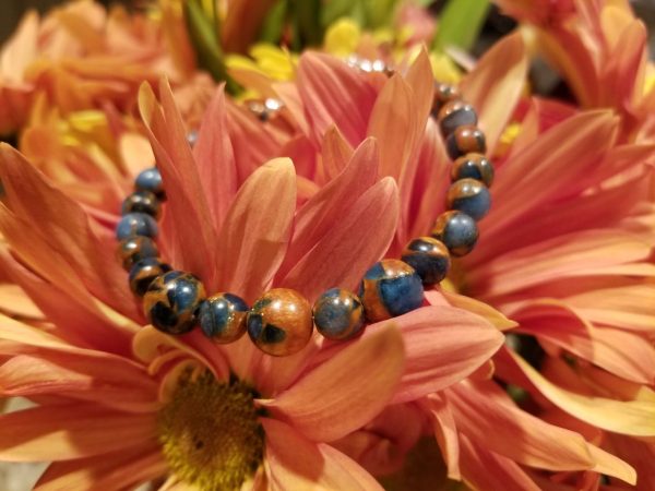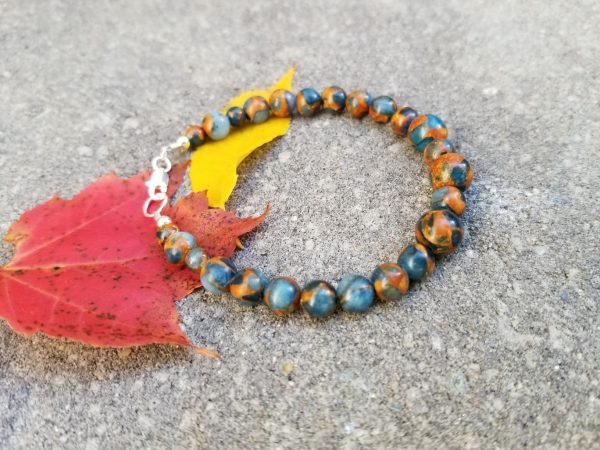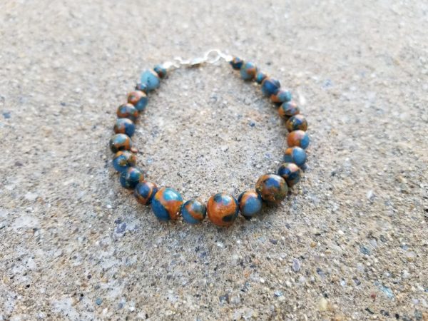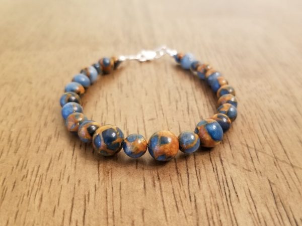 B394 Impression Jasper Bracelet – This bracelet contains 8 mm and 6 mm round, impression jasper, genuine gemstone beads strung on durable beading wire with sterling silver findings which includes a lobster clasp.  The jasper has various shades of blues and earthy rust/terracotta neutrals.  The designs on each bead are natural and unique.  The bracelet measures 7.25 inches long. Let me know if you need it a little longer.  *JASPER is believed to enhance strength, guidance, balance and independence.  Jasper is often referred to as a nurturing stone. *This listing is for ONE IMPRESSION JASPER BRACELET only.  *Additional photo shows how it coordinates with a matching necklace.