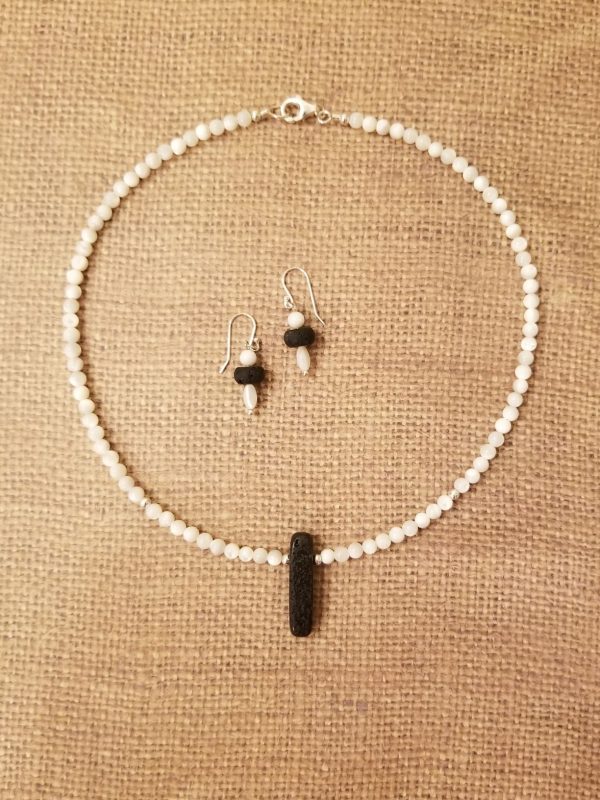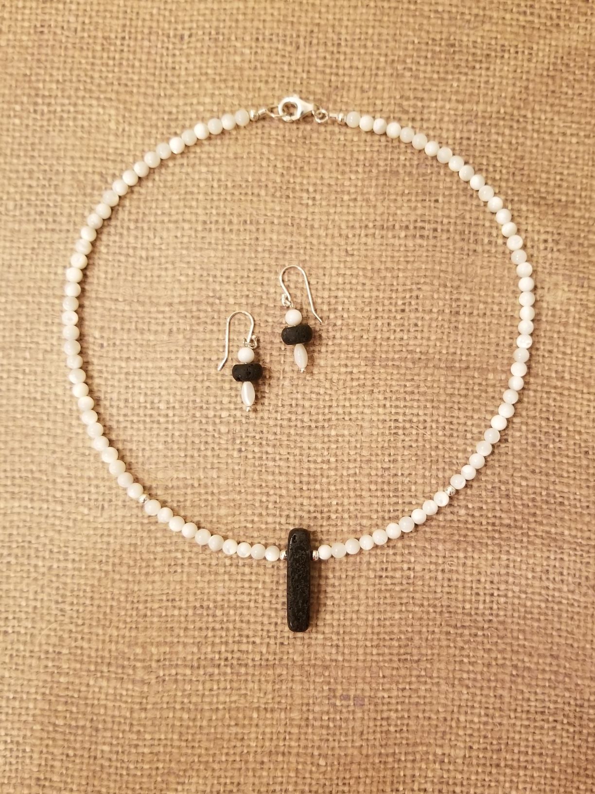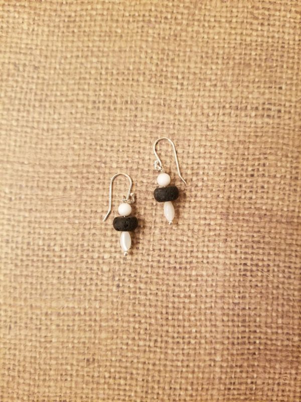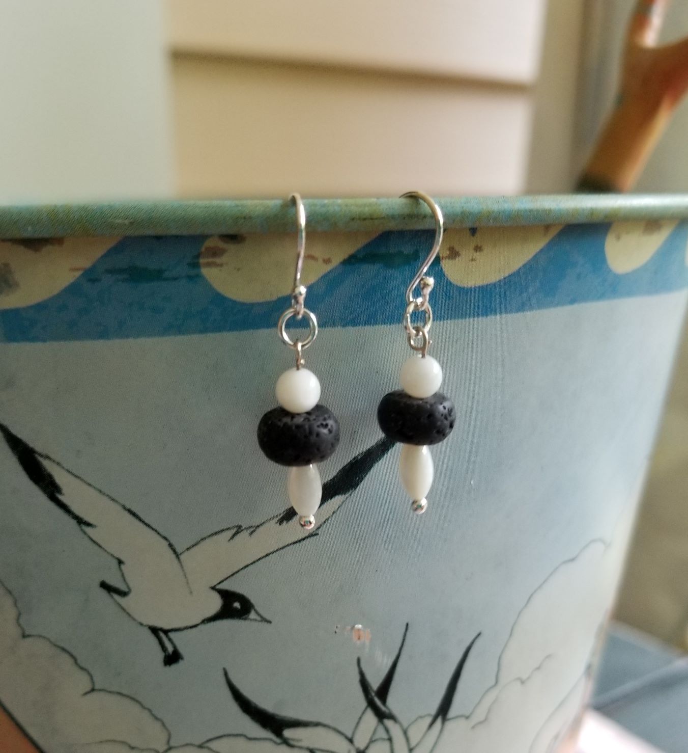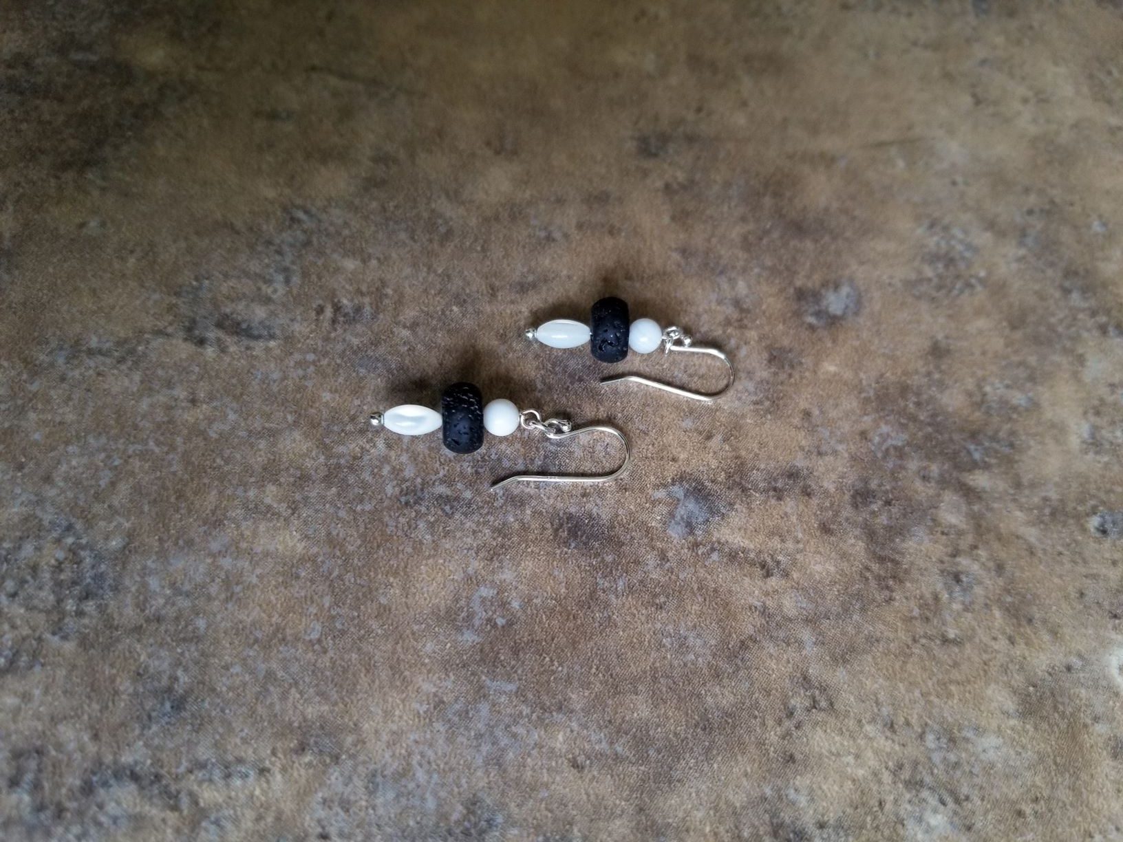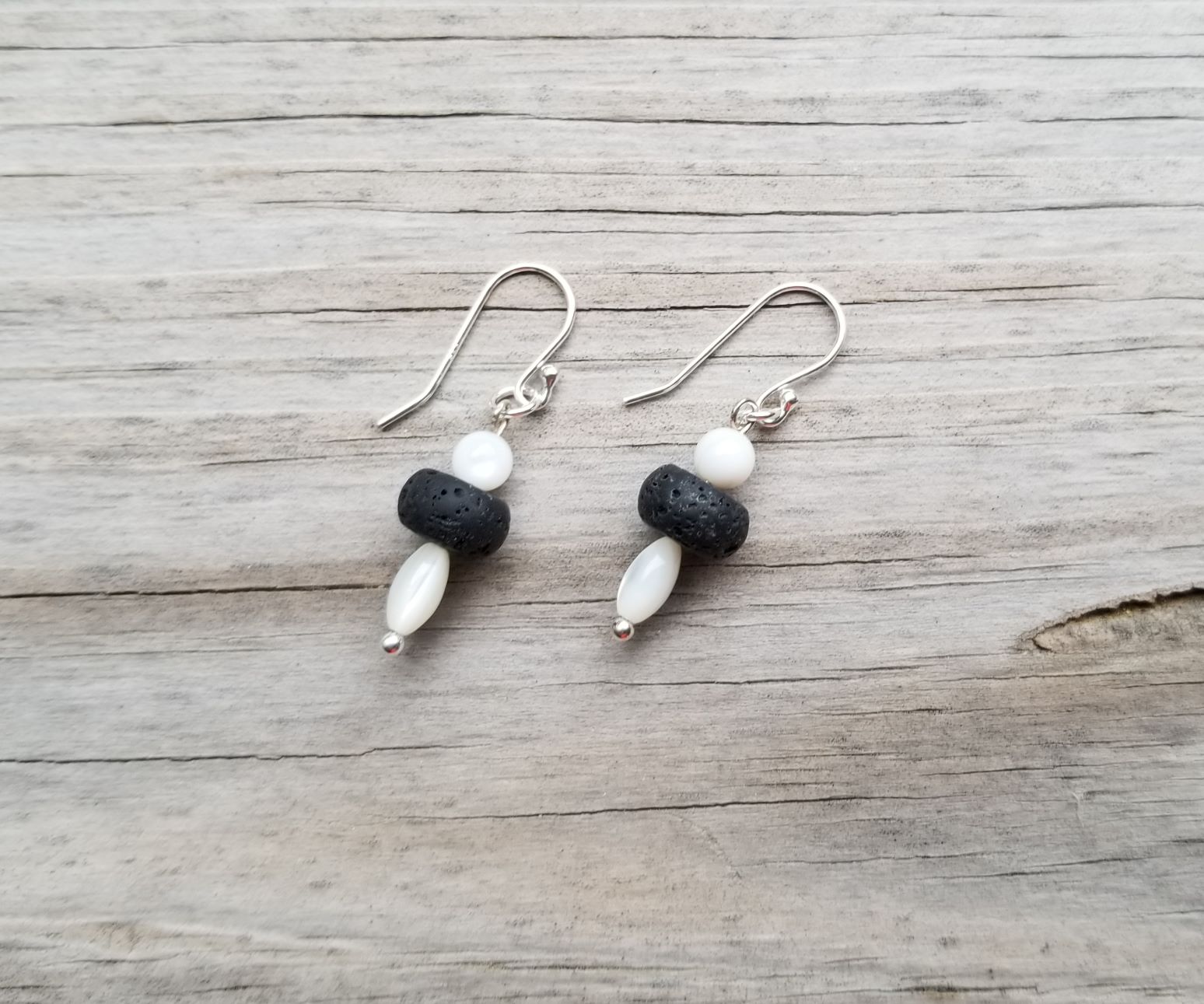 E108 Black Lava, White Shell and Mother of Pearl Diffuser Earrings – These earrings are made with sterling silver findings, 4 mm round white shell beads, 5 mm x 8 mm black lava rondelle shape beads and 4 mm x 6 mm white mother of pearl beads. The genuine black lava beads enable you to wear your favorite essential oil all day or into the evening without risk of the oils irritating your skin. The earrings dangle and the lava beads do not touch your skin. These handmade earrings are one of a kind and very versatile with their neutral colors. **FREE rubber earring backs included. ** View all my diffuser jewelry to see other pieces you can coordinate with these lava beads. ****This listing is for EARRINGS ONLY. Last photo shows how earrings can coordinate with a diffuser necklace.