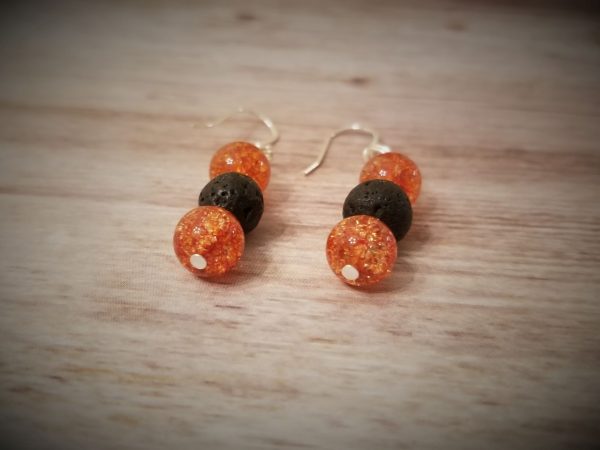 E150 Orange Crackle Quartz and Black Lava Diffuser Earrings – These handmade earrings contain 8 mm round, black lava and dyed orange crackle quartz gemstone beads. The earrings are made with sterling silver findings and measure approx. 1 5/8 inches long. *FREE rubber earring backs included. BLACK LAVA is believed to enhance passion, strength and creativity. QUARTZ is believed to promote healing, clarity and creativity as well. You can apply your favorite essential oil scent to the porous black lava beads to wear all day or into the night. Because the lava beads do not touch your skin even people with sensitive skin can wear their favorite essential oils.