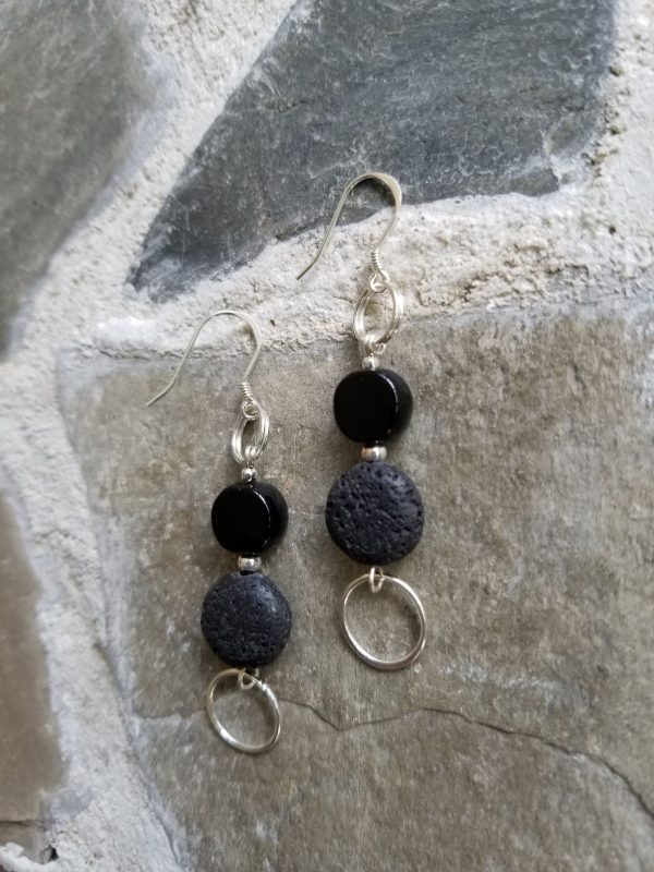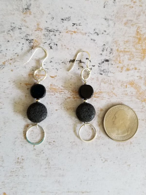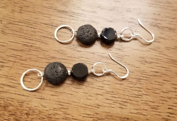 E154 Black Lava and Black Jet Diffuser Silver Earrings – These handmade earrings are made of 12 mm round genuine black lava and 10 mm round genuine black jet gemstone beads.  These diffuser earrings are made of sterling silver findings and measure approx. 2.25 inches long.  Your favorite essential oils can be applied to the porous black lava beads so your favorite scent can be enjoyed all day or into the evening.  BLACK LAVA is believed to enhance passion, strength and creativity.  JET gemstones are believed to be grounding and a powerful protection and purification stone.  ***FREE rubber earring backs included.