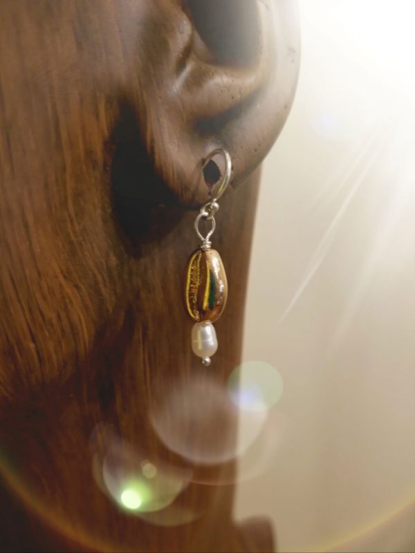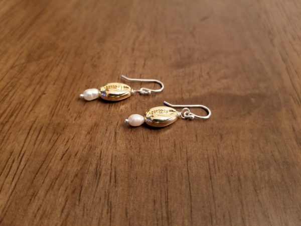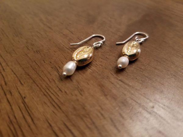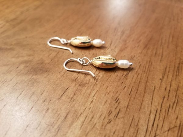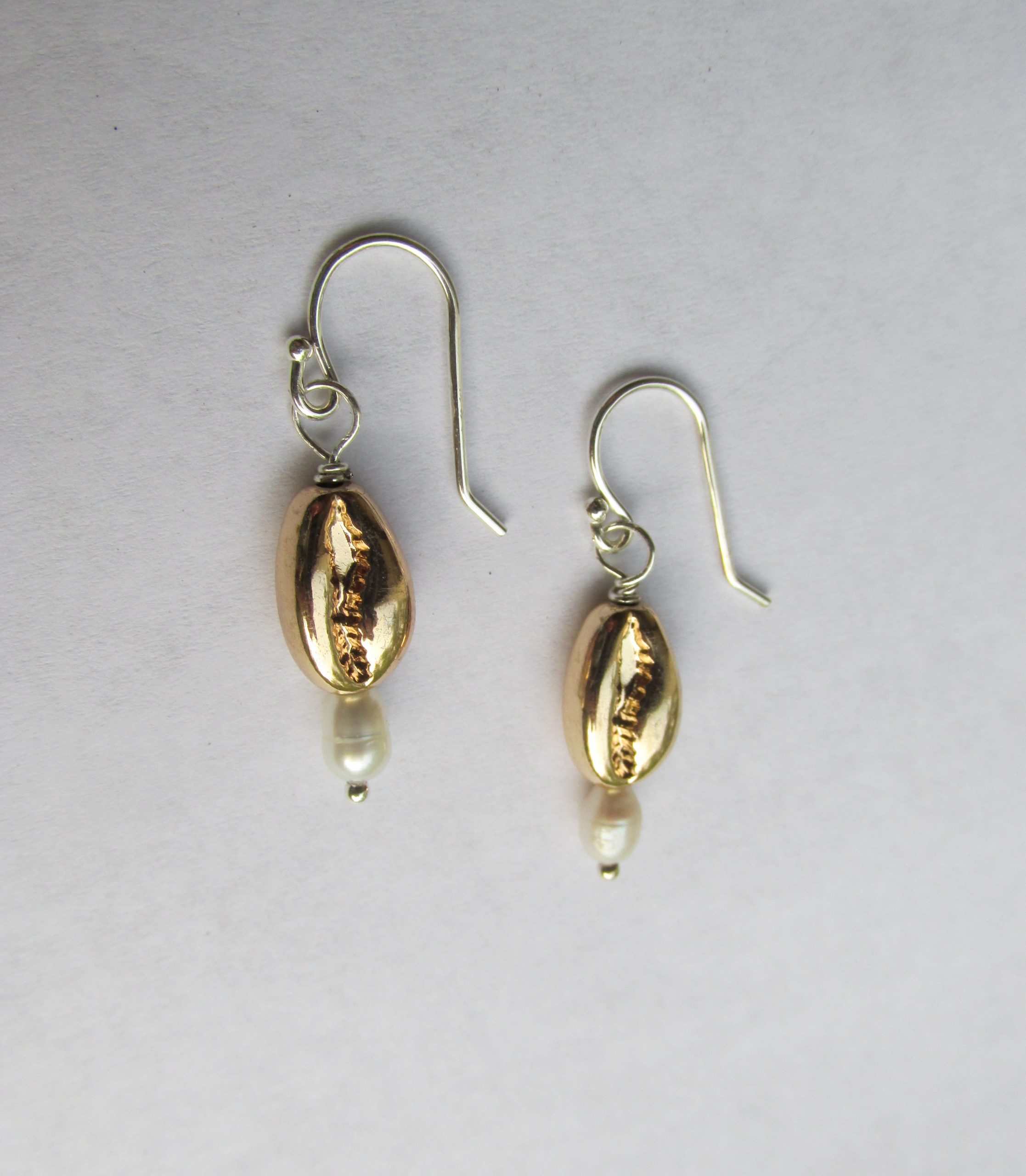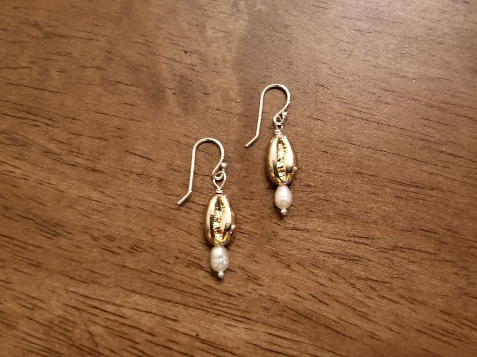 E183 Gold Cowrie Shell and White Freshwater Pearl Two-Tone Earrings  – These handmade earrings are eye catching with their gold-tone cowrie shells, 3 mm white freshwater pearls and sterling silver findings.  The pearls are very clean and have beautiful luster.  The earrings measure approx. 1.25 inches long. *FREE rubber earring backs included. *PEARLS are a symbol of innocence and purity and are believed to enhance imagination. *JUNE birthstone is pearl.