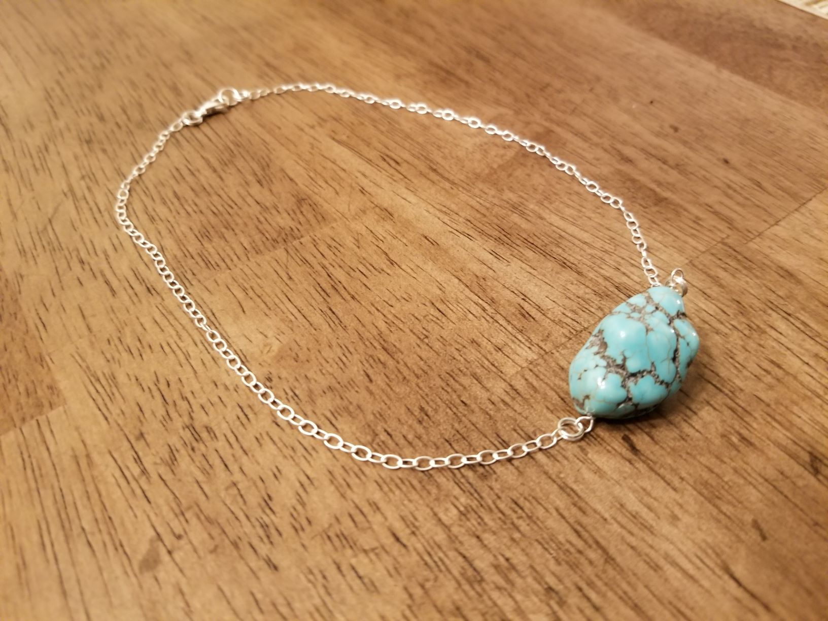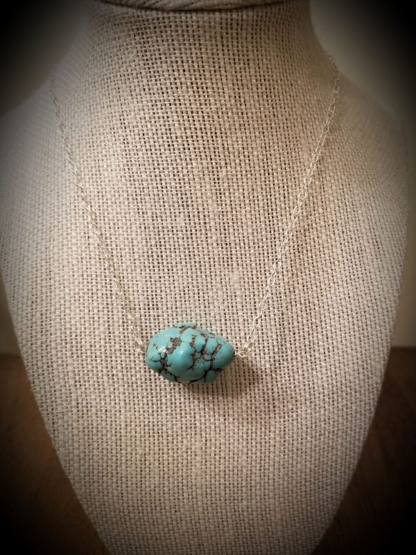 N160 Turquoise Rustic Howlite Silver Necklace – This handmade turquoise dyed howlite necklace has an approx. 19 x 30 mm rustic nugget howlite bead in the center. The necklace is made with sterling silver oval cable chain and findings which includes a lobster clasp. The necklace is an adjustable 16.25 – 16.5 inches long. This is a one of a kind statement necklace which looks great with a dressy outfit or a casual outfit. This turquoise howlite necklace is great for a December birthstone. HOWLITE is believed to enhance meditation, relaxation, patience and memory.