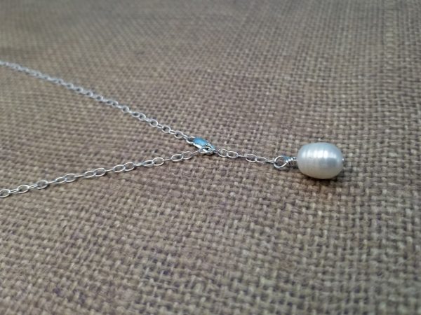 N185 White Freshwater Pearl Silver Lariat Necklace – This handmade necklace contains a 9 mm x 11 mm white freshwater pearl with beautiful luster and is very clean. The necklace is made of 2.4 mm wide, sterling silver, oval cable chain which has a lobster clasp. The necklace measures 18.25 inches long and can be adjusted to a shorter length. *PEARL is believed to enhance imagination and is a symbol of innocence and purity. *Pearl is the birthstone for JUNE. Great Wedding Gift for bride or bridesmaids!