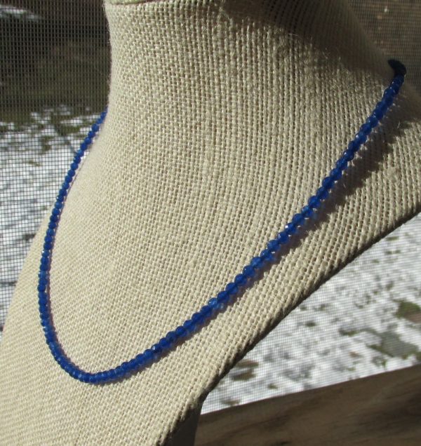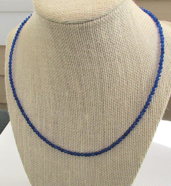 N216 Royal Blue Faceted Genuine Jade Minimalist Necklace – Materials: 3mm faceted round royal blue jade beads, beading wire, sterling silver findings including a lobster clasp.  Measures an adjustable 17.75-18 inches long.  Handmade in New Hampshire.  *JADE is believed to promote harmony and enhance luck and prosperity.