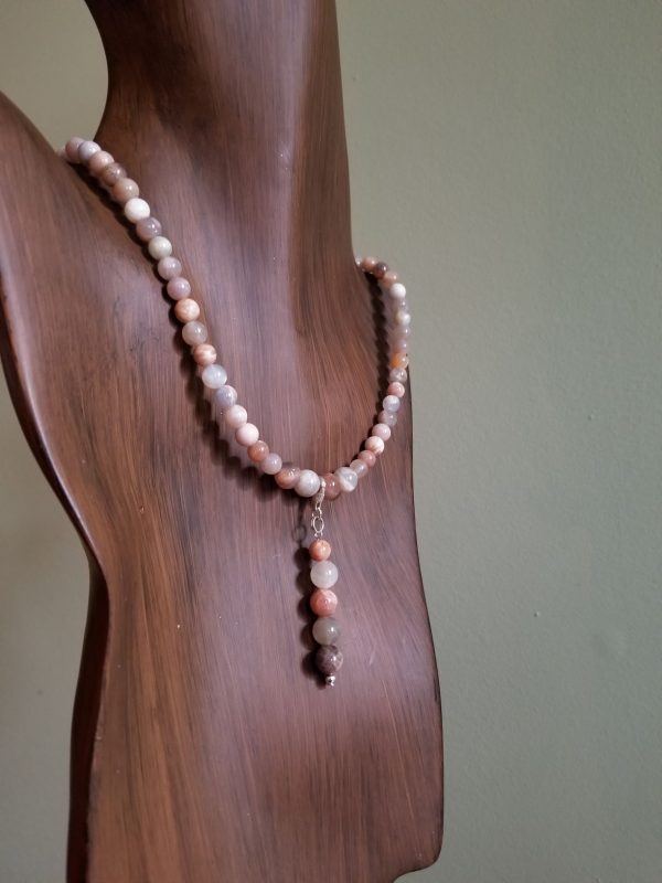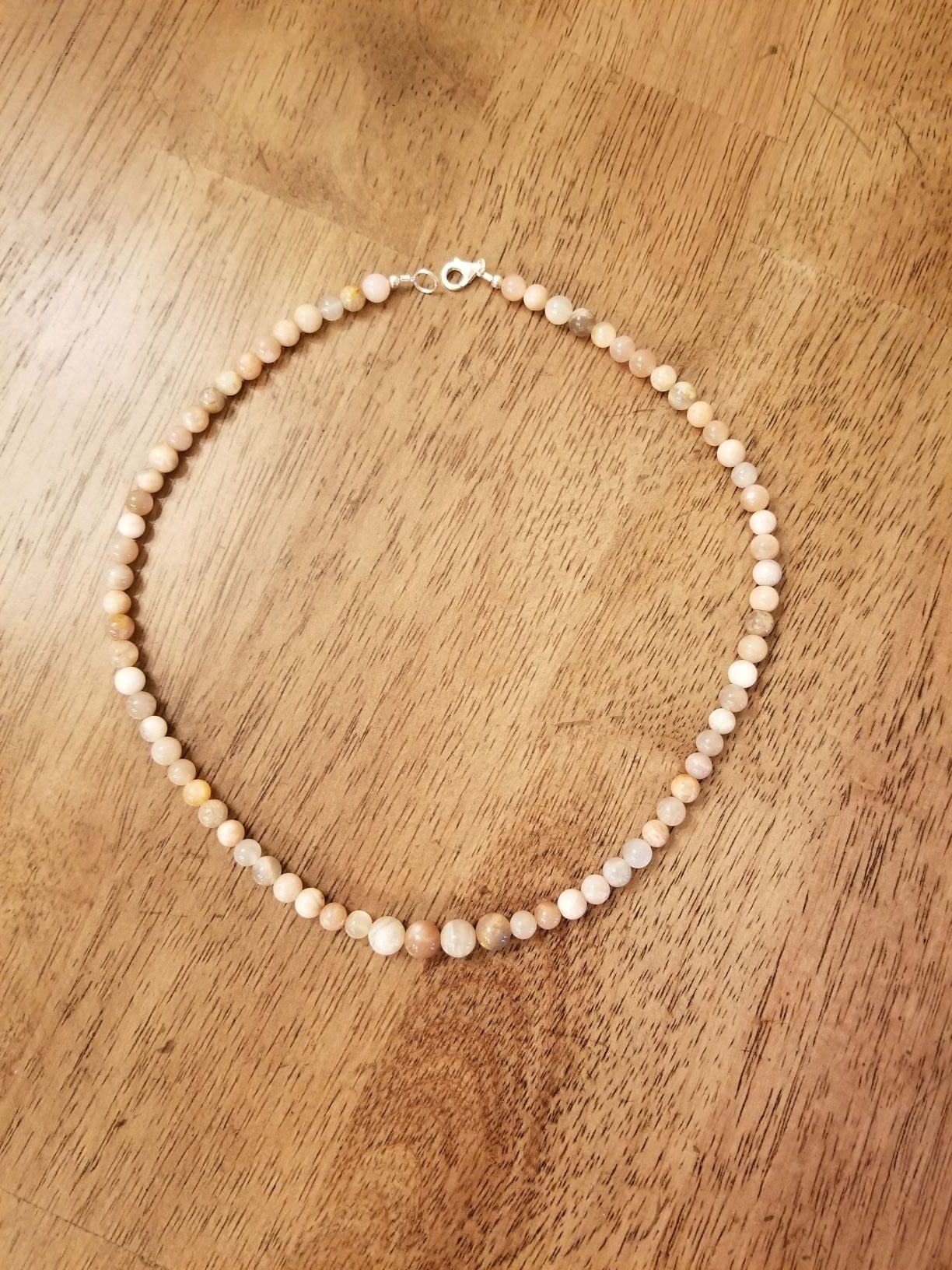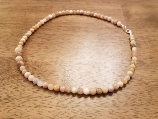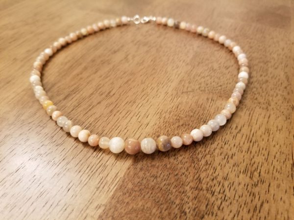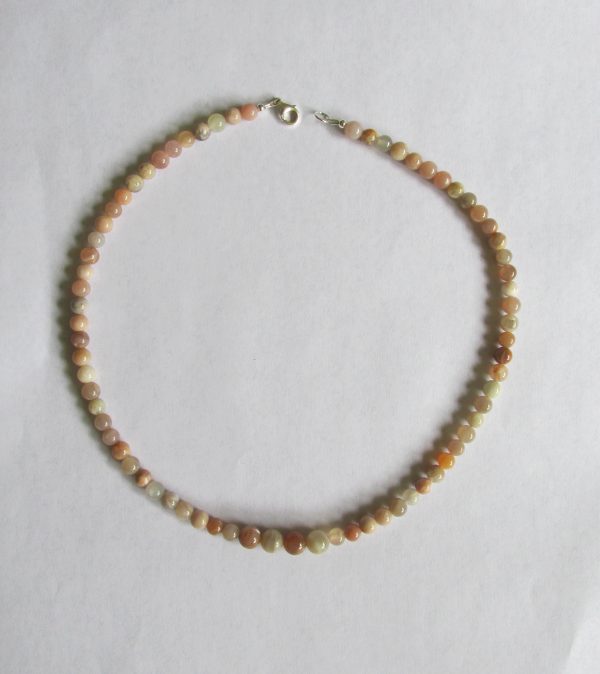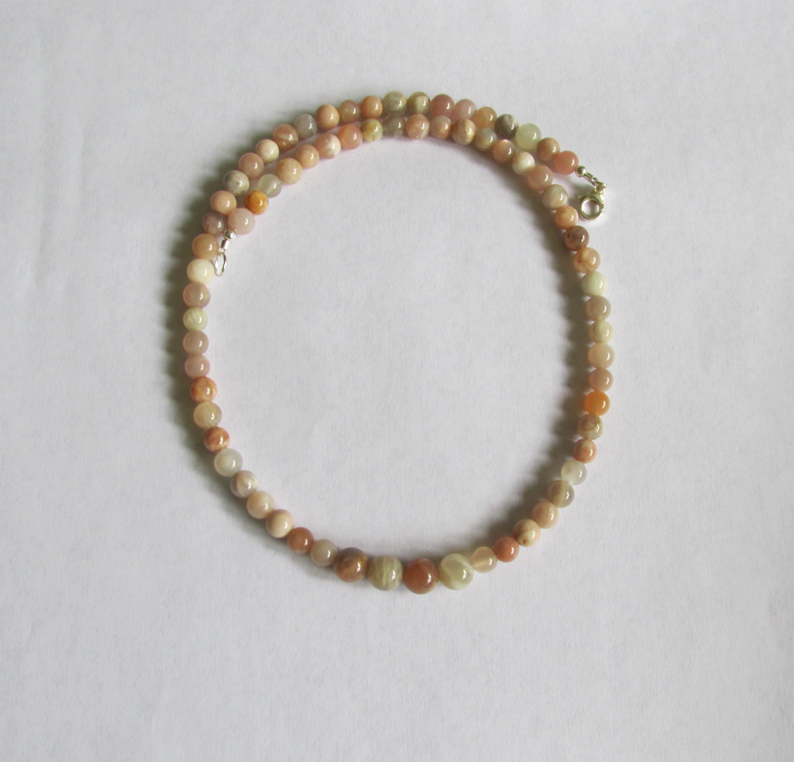 N96 Genuine Sunstone Gemstone Necklace – This handmade necklace has 8 mm round sunstone gemstone beads in the center along with 6 mm round sunstone beads. The necklace is strung on durable beading wire with sterling silver findings which includes a lobster clasp. The necklace measures 17.75 inches long and looks beautiful as is or with a clasp bail pendant. *This listing is for ONE SUNSTONE NECKLACE ONLY. **Additional photos show how it looks with a pendant. (Also available here in my shop.) *SUNSTONE is believed to enhance courage, happiness and well being.