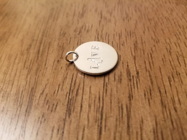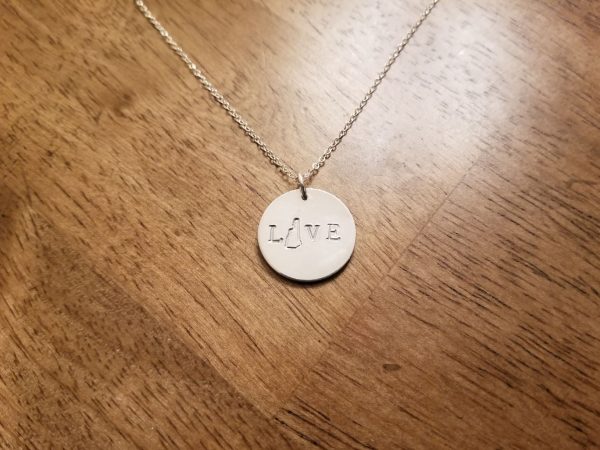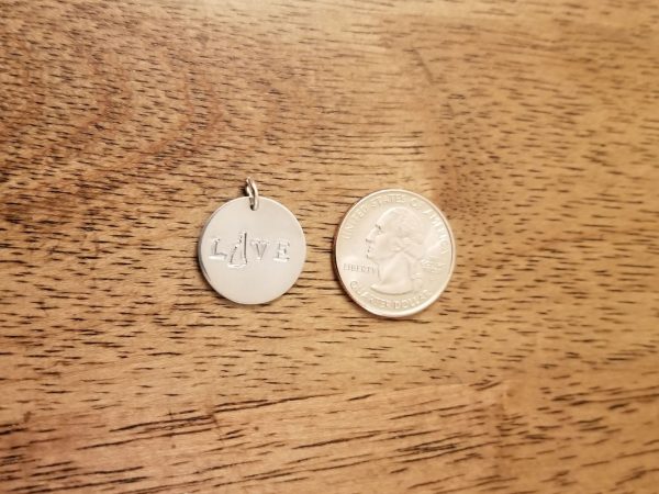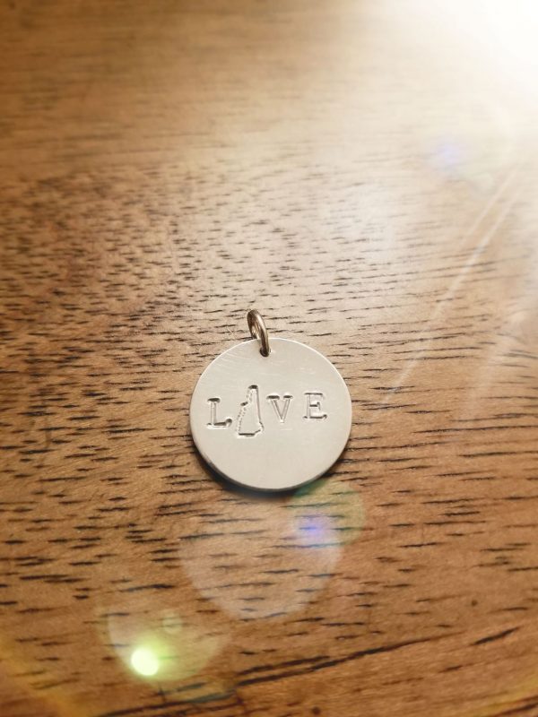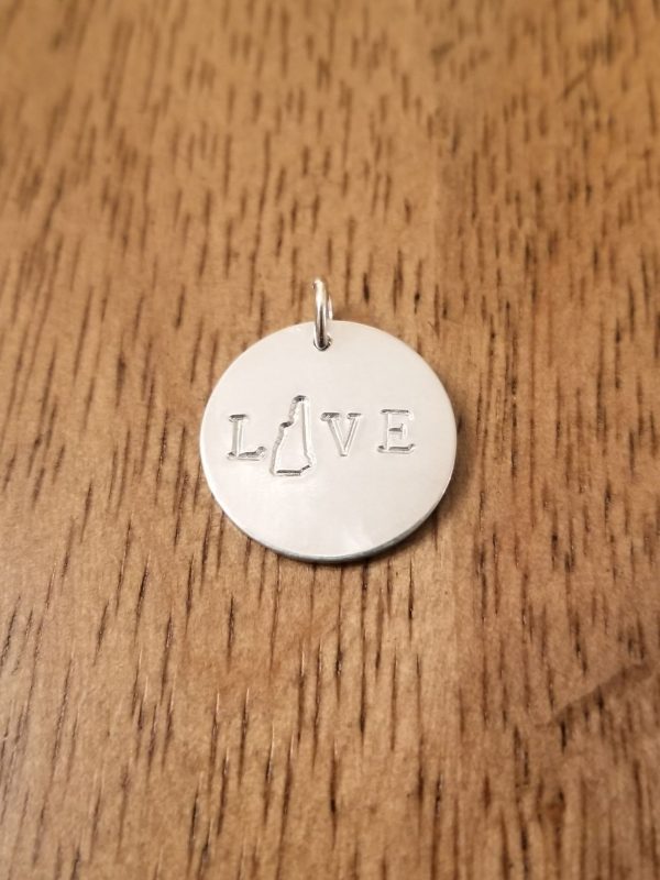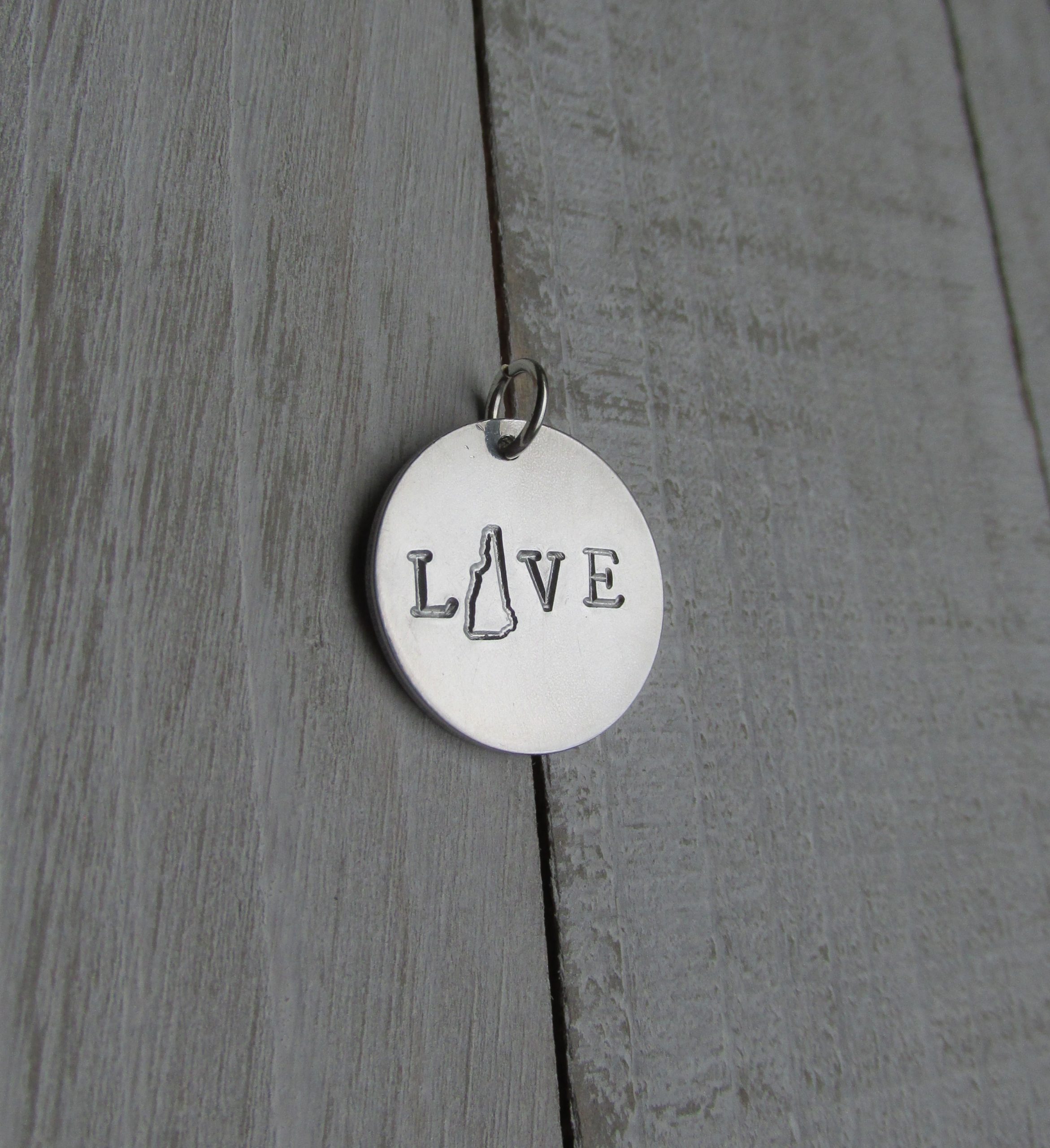 P372 LOVE NH Silver Tone Hand Stamped Pendant – This pendant has a 20 mm round aluminum disc which is hand stamped with ‘LOVE and the NH outline’. The pendant measures approx. 7/8 of an inch long. *This listing is for ONE NH PENDANT ONLY. **Additional photo shows how it looks on a necklace. GREAT GIFT for anyone who has lived in, visited or loves New Hampshire.